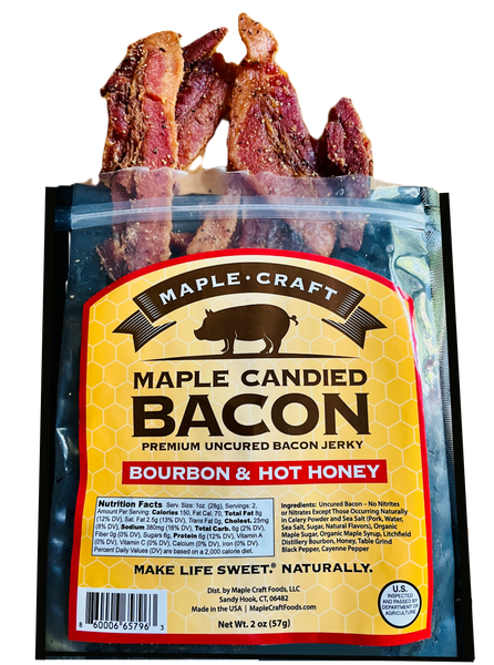 There aren't many things that make everything else better like bacon and maple each do...so we combined them! And nothing sells out faster when we attend food & beverage festivals & shows than our Maple-Candied Bacon. So after many months of some very tasty R&D, our Maple-Candied Bacon is now available in two premium, shelf-stable, all-natural versions...original Sweet & Smokey and Bourbon & Hot Honey...both made with uncured, nitrite and nitrate-free, thick cut smoked bacon and glazed with organic maple syrup and maple sugar that your customers are going to LOVE too! They'll snack on it right out of the package like jerky, they'll serve it for breakfast, and they'll put it on/in burgers, salads, ice cream, baked beans and more! The Bourbon & Hot Honey variety adds honey, a touch of cayenne and black pepper and award-winning bourbon from our friends at The Litchfield Distillery.